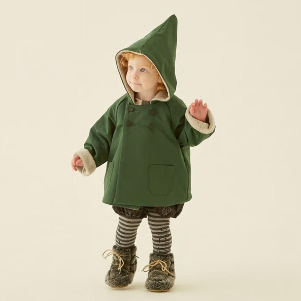 定番のとんがりフードとAラインシルエット、ラグランスリーブ、ダブルブレストにオリジナルのeLf釦が妖精王国の証のこびとのコート “eLf coat”。