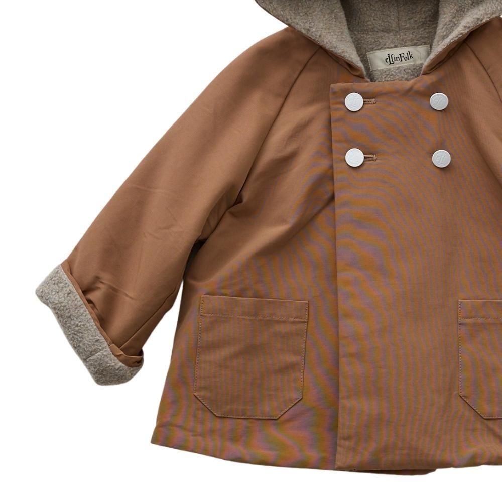 定番のとんがりフードとAラインシルエット、ラグランスリーブ、ダブルブレストにオリジナルのeLf釦が妖精王国の証のこびとのコート “eLf coat”。