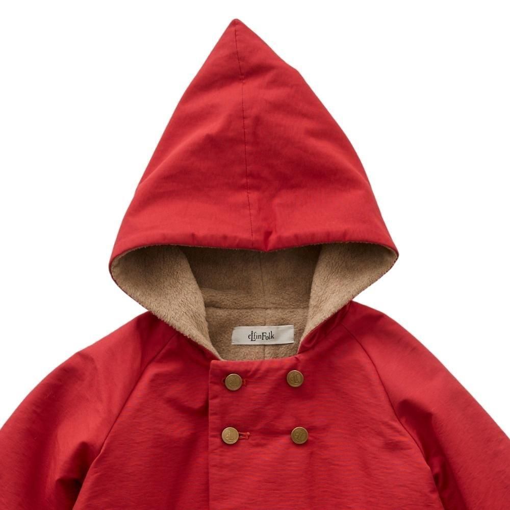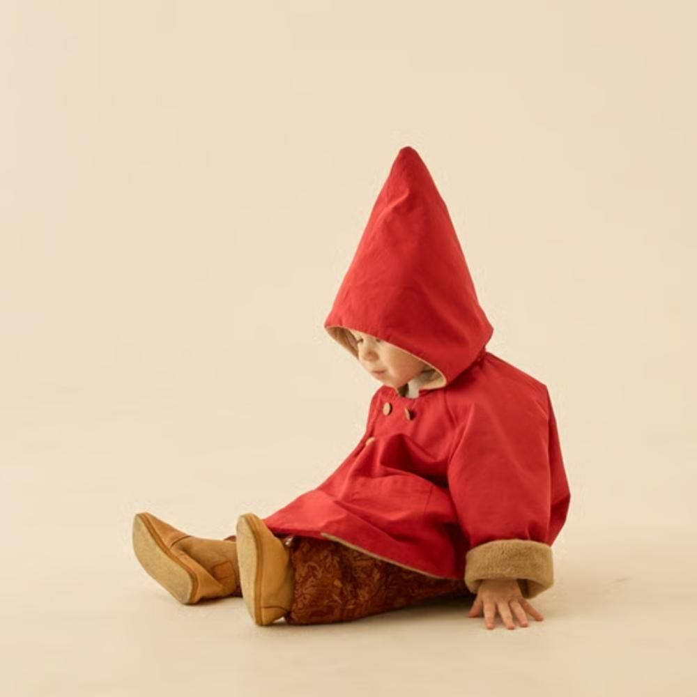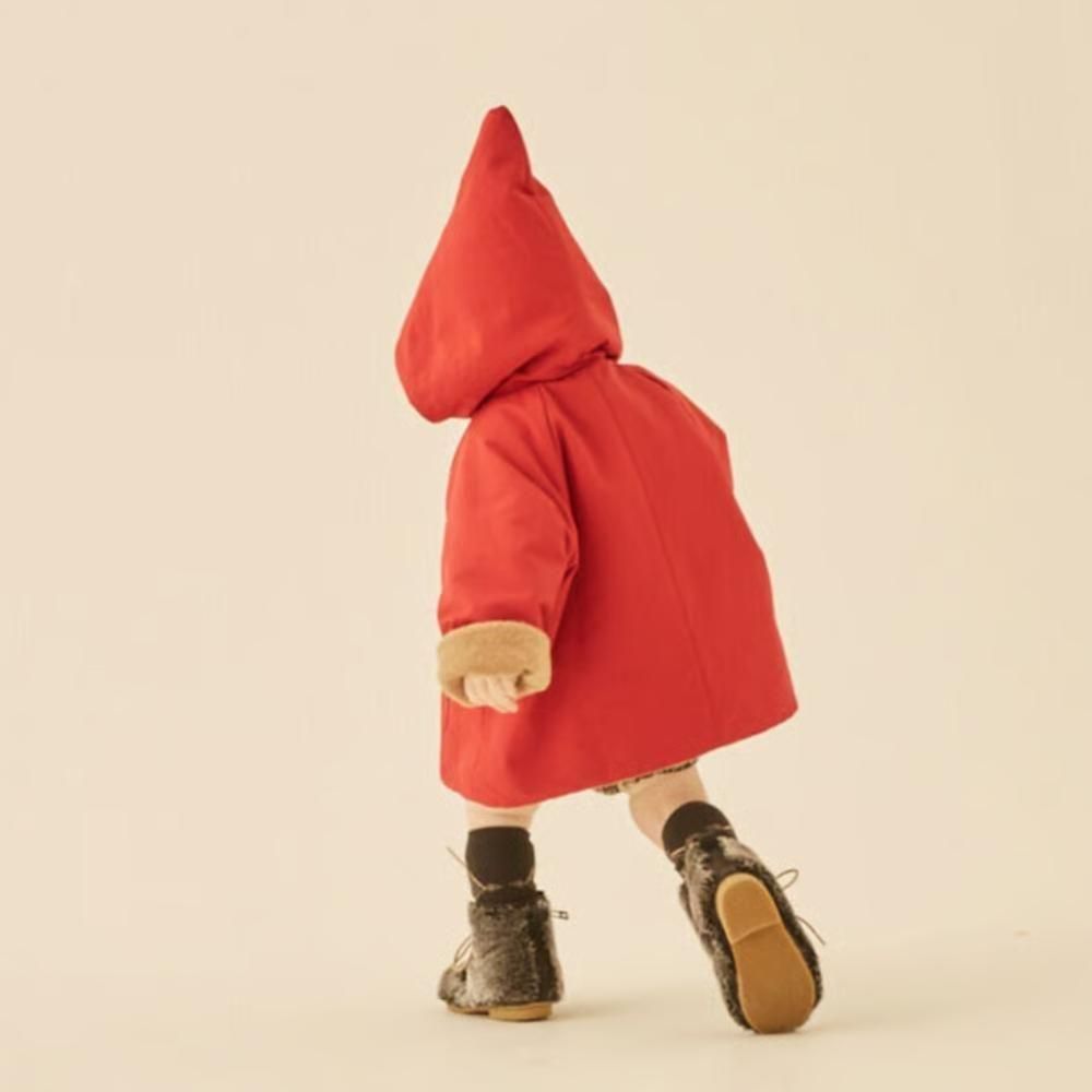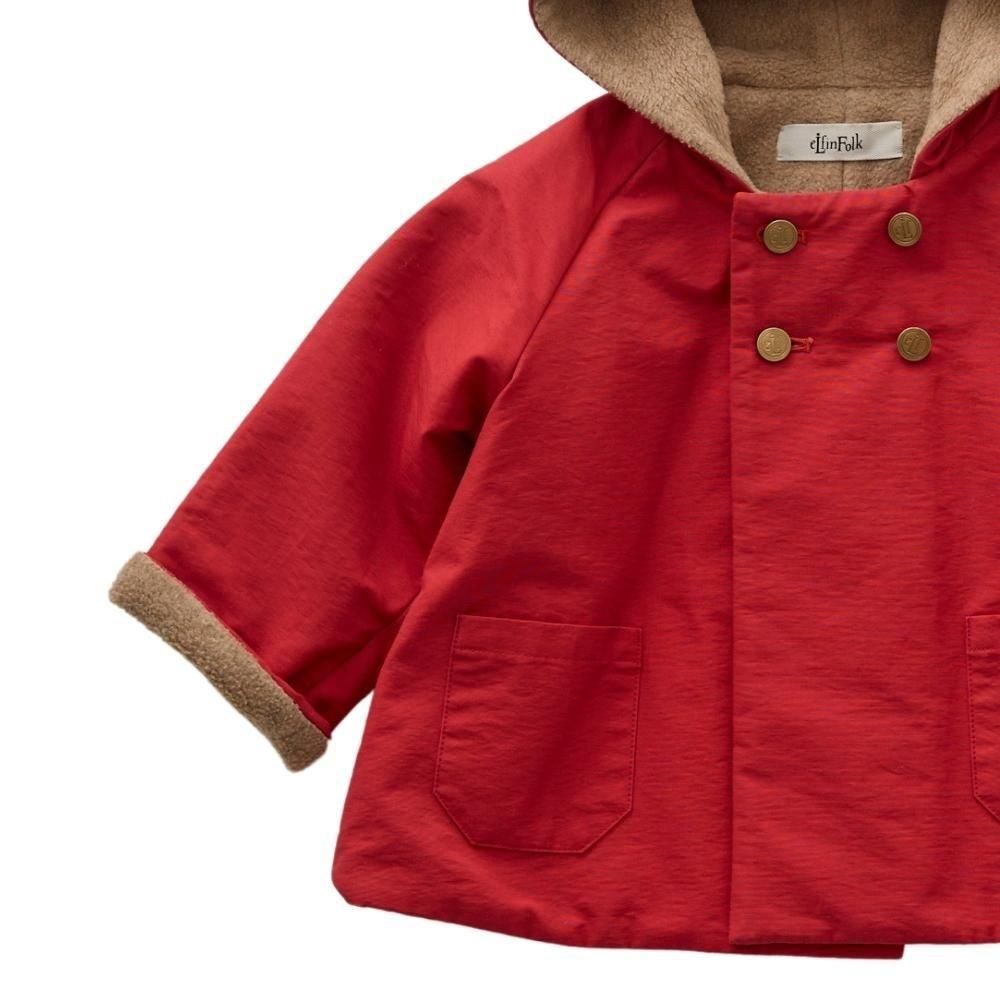 定番のとんがりフードとAラインシルエット、ラグランスリーブ、ダブルブレストにオリジナルのeLf釦が妖精王国の証のこびとのコート “eLf coat”。