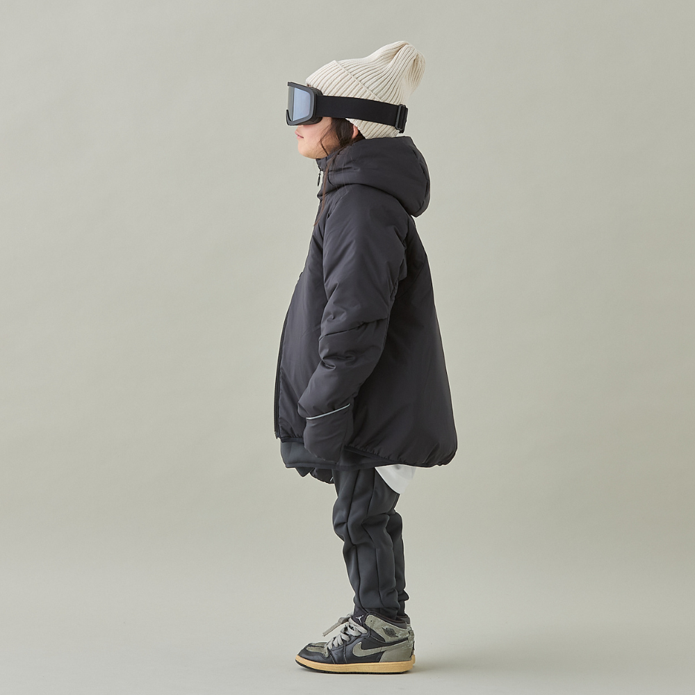 高めのフードや、絞られた裾、ミトンの仕様で、暖かさを逃がしません
