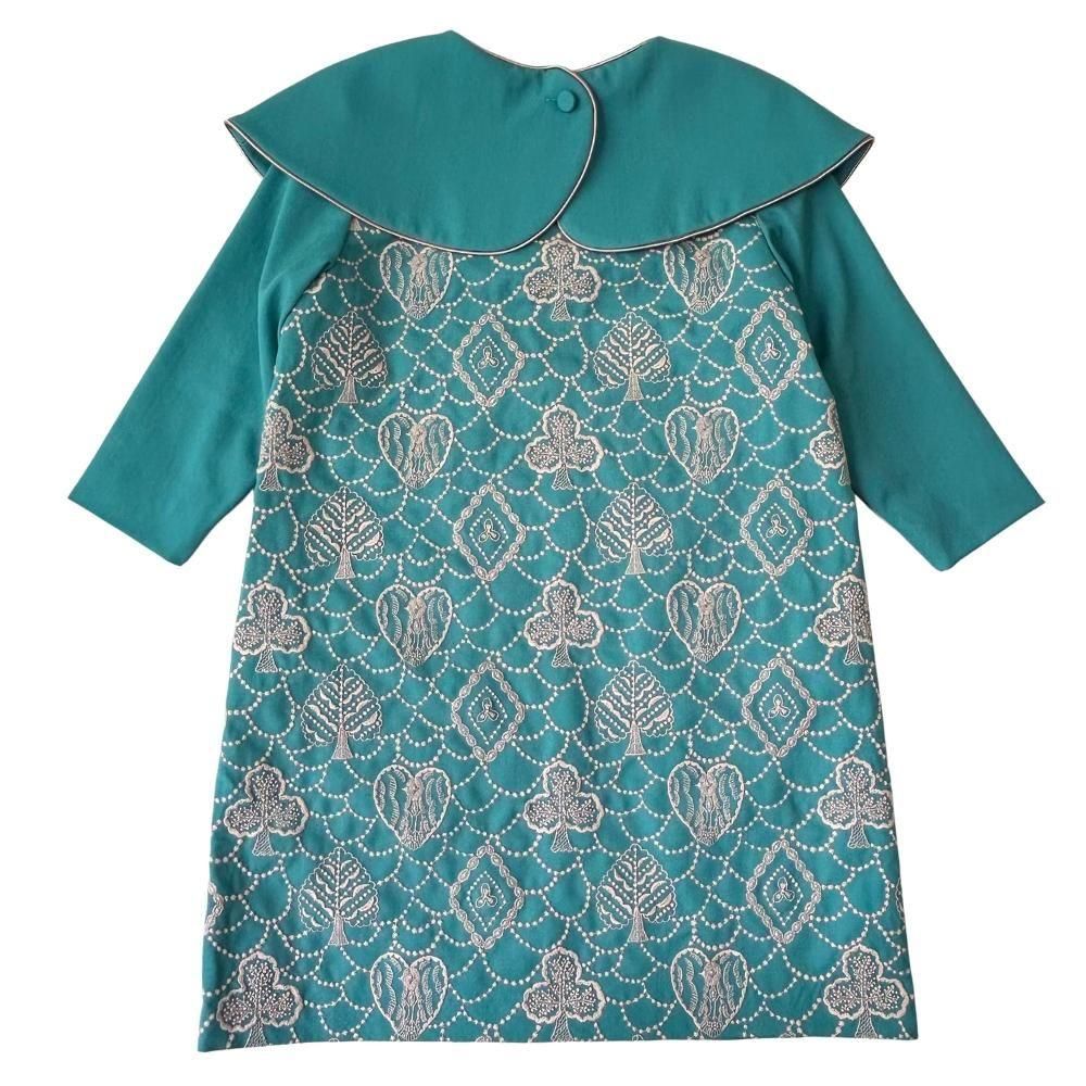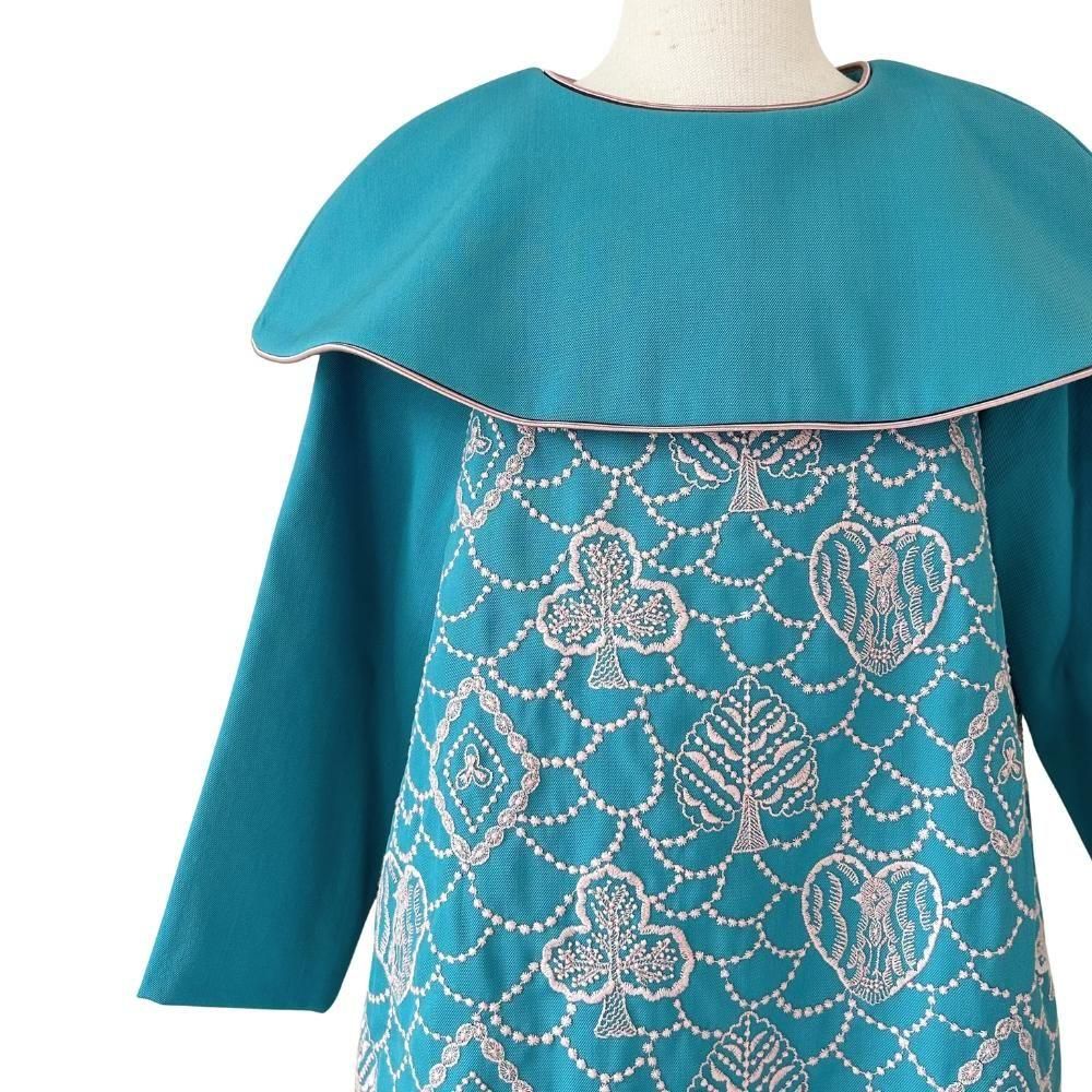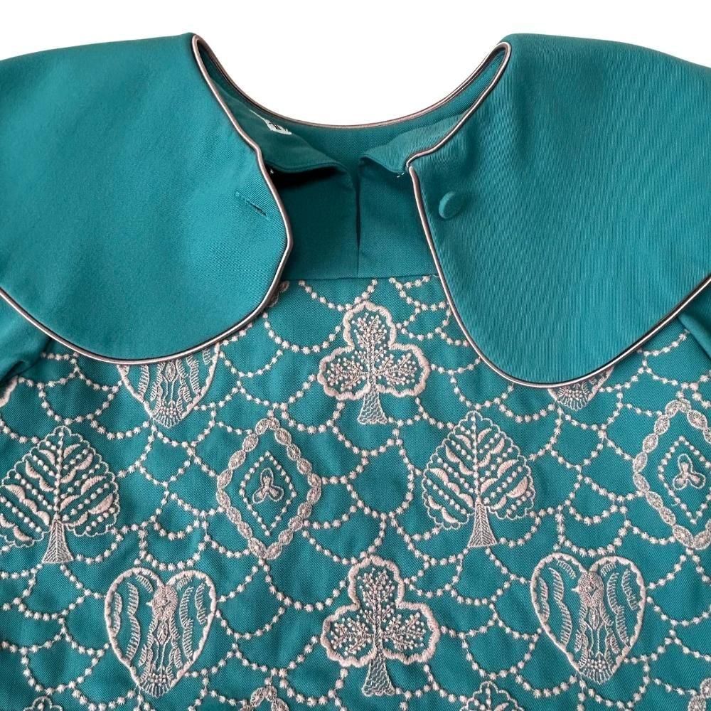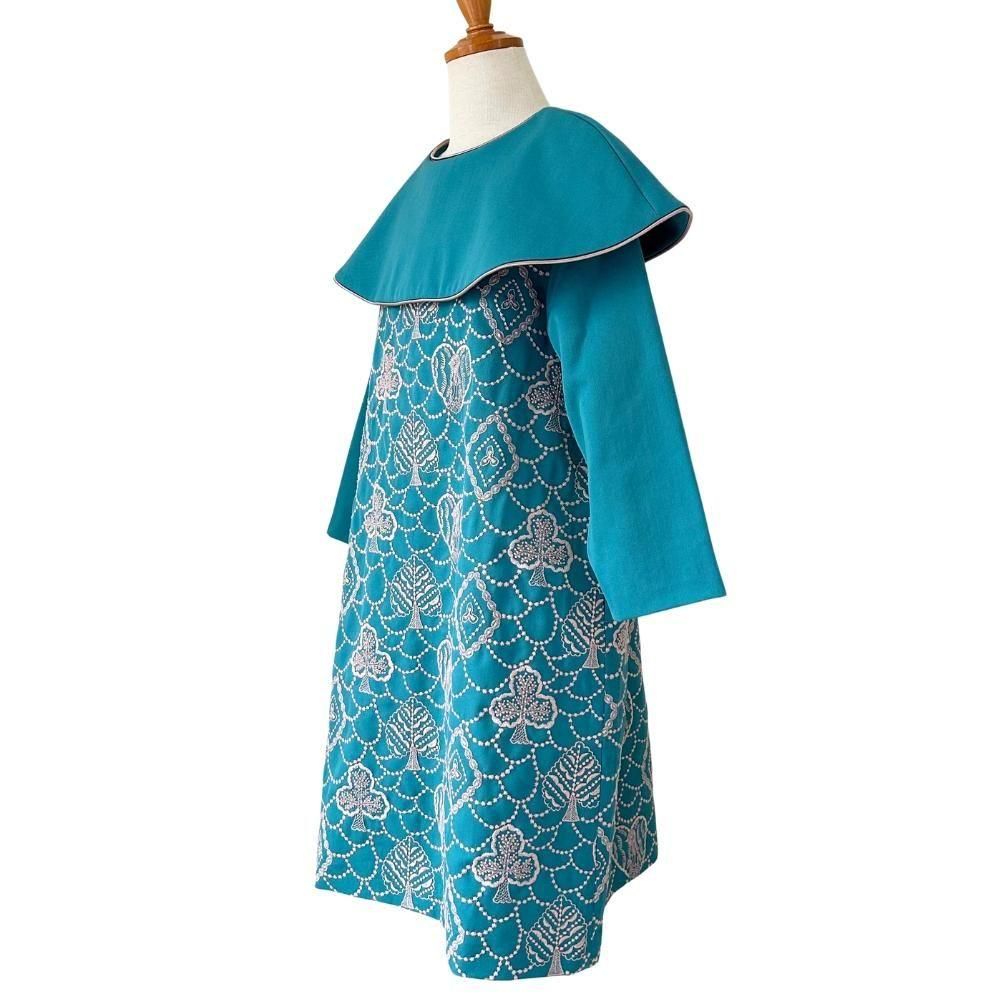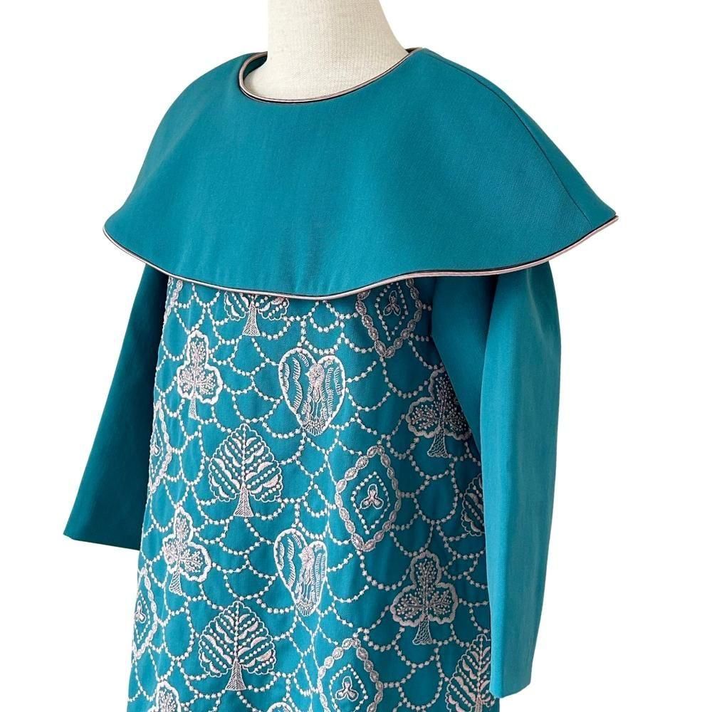 強く撚ったウール糸を使用した綾織の生地に刺繍を施したドレス。しなやかな風合いと落ち感のある生地感です。大きな襟がアクセントになった華やかな一着。