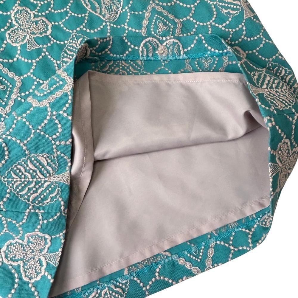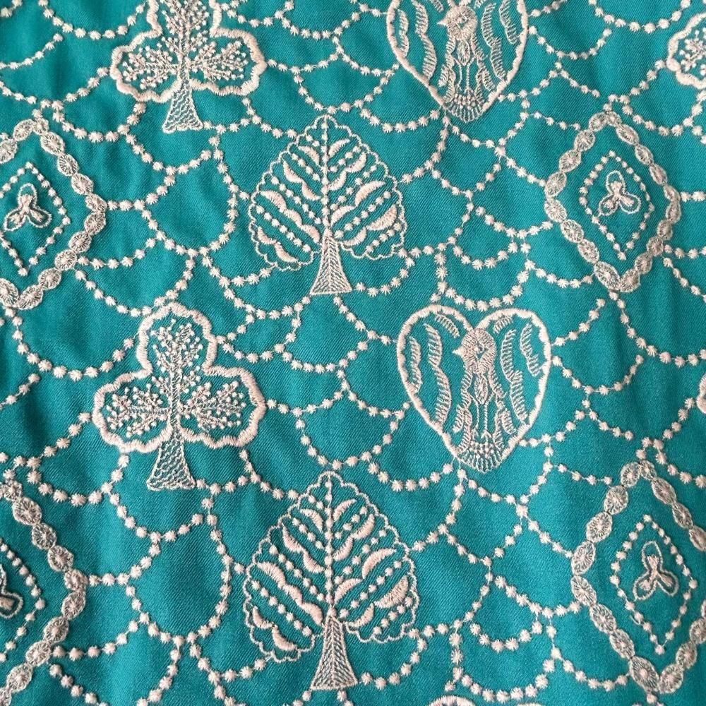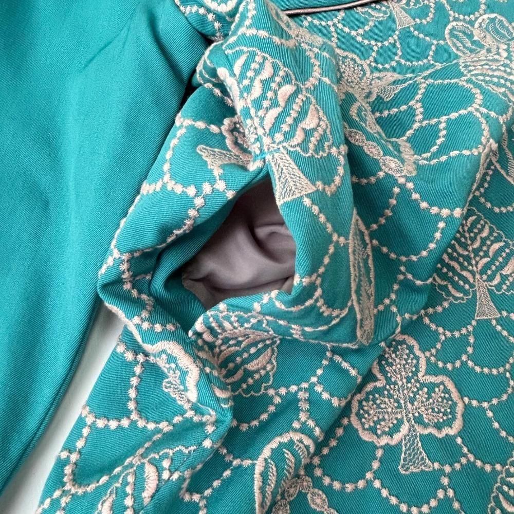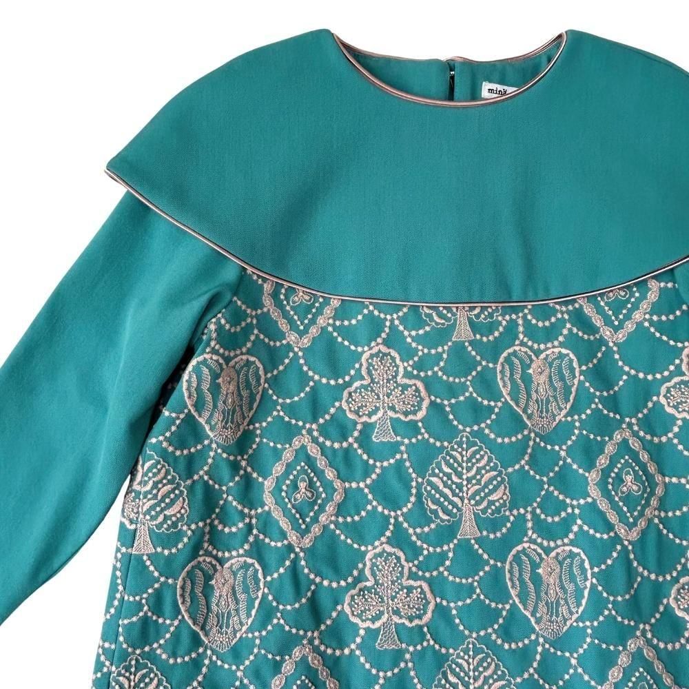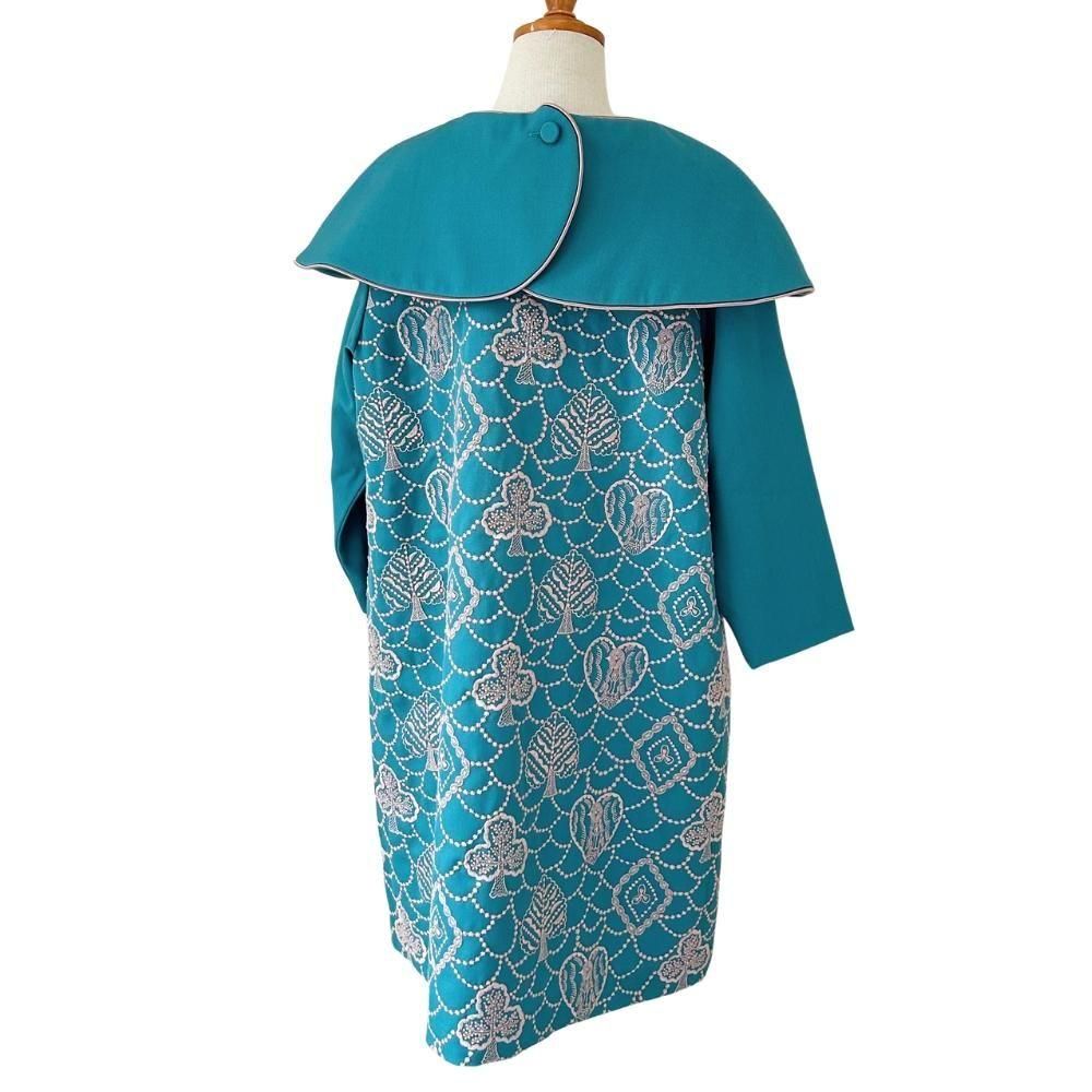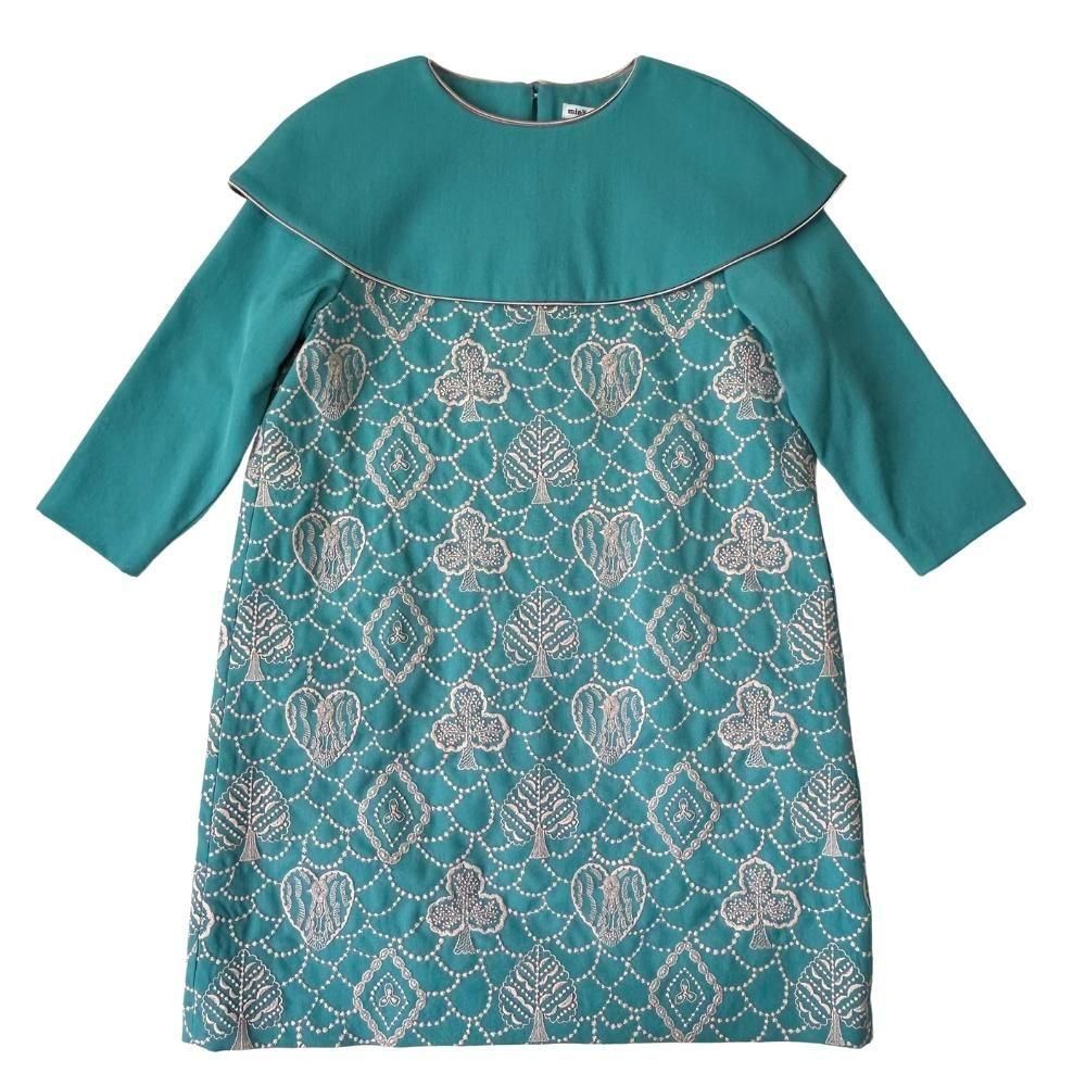 強く撚ったウール糸を使用した綾織の生地に刺繍を施したドレス。しなやかな風合いと落ち感のある生地感です。大きな襟がアクセントになった華やかな一着。