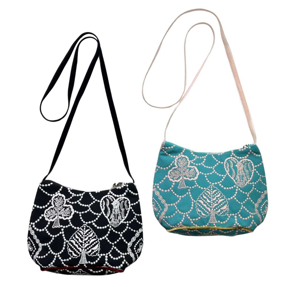 強く撚ったウール糸を使用した綾織の生地に刺繍を施した小さなポシェット。