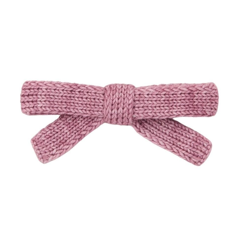 メリノウールのワニ口クリップにあしらわれた、手編みのジャンボサイズのゴールディ・ボウ。